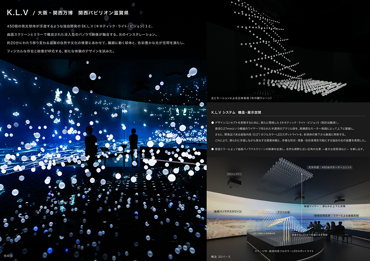 関西パビリオン滋賀ブースの展示デザイン依頼を受け、まず大切にしたのは、他パビリオンに比べ圧倒的に小さな空間の中で、いかに来場者に驚きと強い印象を残す体験を届けるかということでした。スケールを生かした没入型空間ではなく、限られた空間でもリアルなモノが動くフィジカルな体験を中心に据え、「テクノロジー」と「イノベーション」を感じられる場にしようと考えました。映像演出だけでは独自性が出ないと考え、発光する球体が浮遊し、その動きに空間映像を重ねる「K.L.V」という新しい表現方法を自ら考案し開発しました。デジタルとリアルが一体となり、一つのシーケンスとして展開される体験をつくりあげました。これを実現するため、LUCENTはK.L.Vシステムをゼロから設計し、精密なモーター制御や超狭角スポットライトの試作、長期展示に耐える設計を目標に据え、試作と検証を重ねました。近年はARやVR、プロジェクションマッピングなどのデジタル演出が広く普及し表現が一般化してきていますが、K.L.Vは光の空間において、リアルとデジタルが調和する新しい方向性を提示し、記憶に残る体験を生むひとつの到達点になったと感じています。